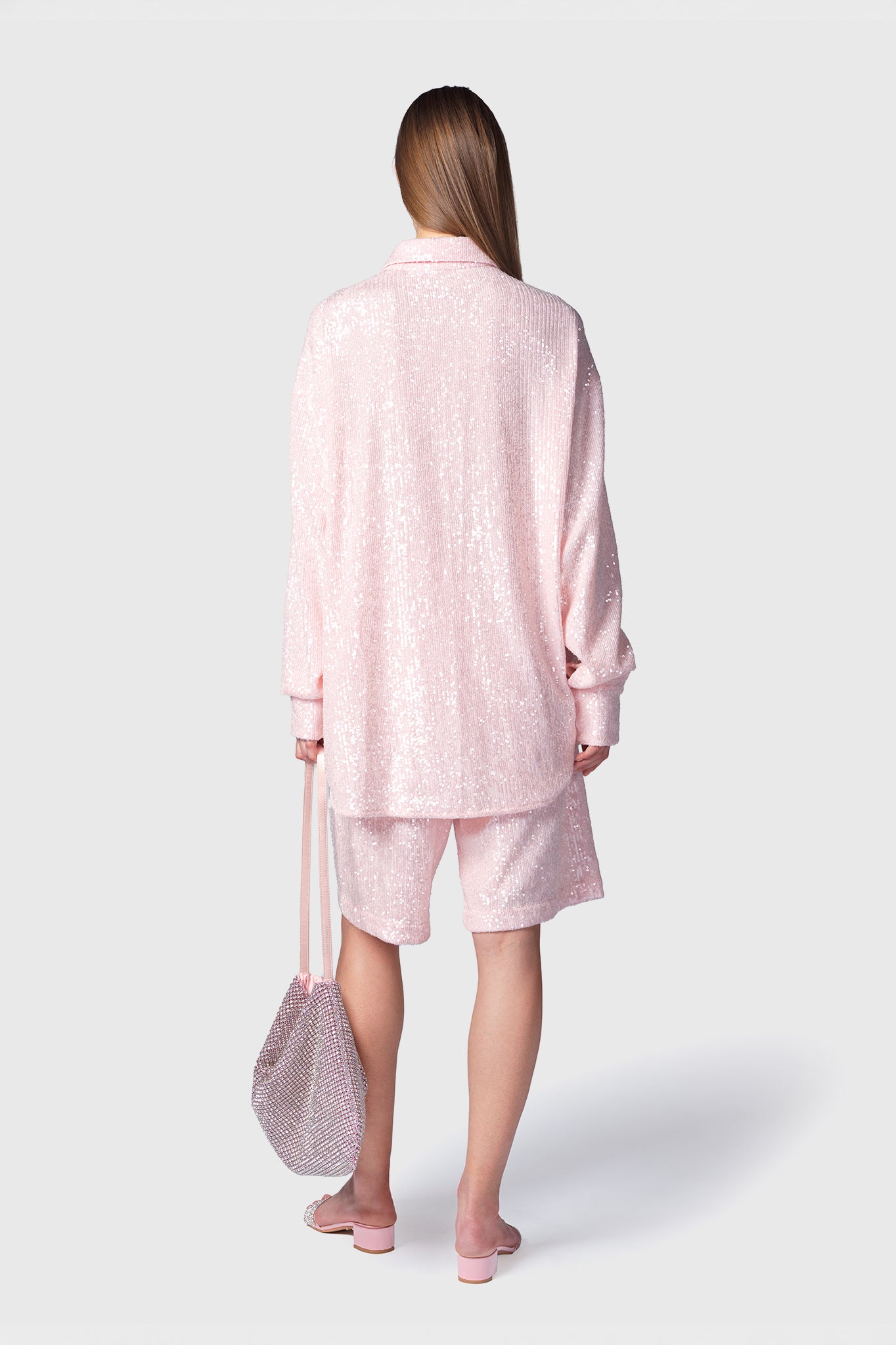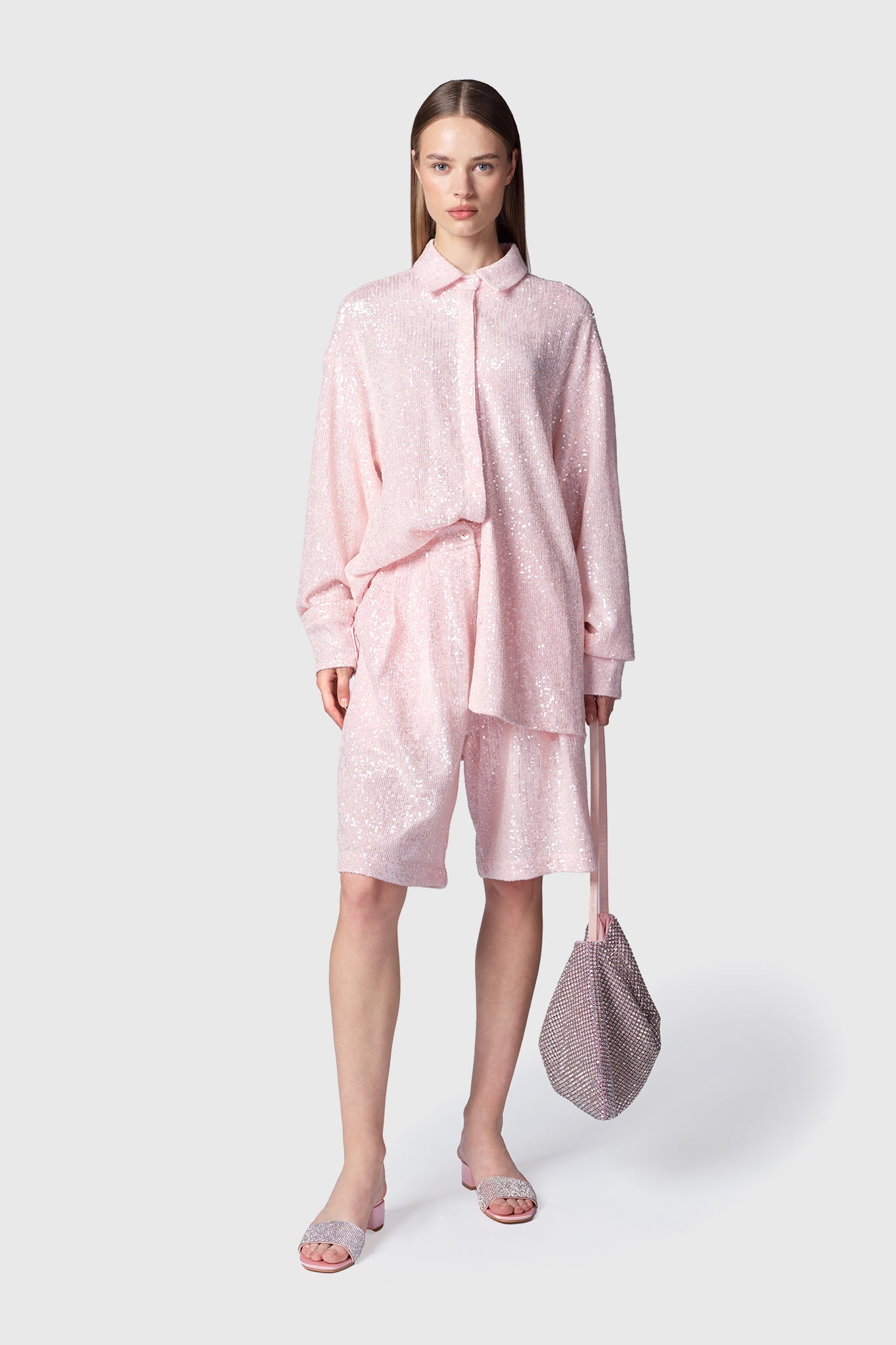 Camisa oversize Lanikai cipria de tejido de micro lentejuelas y detalle de satén.