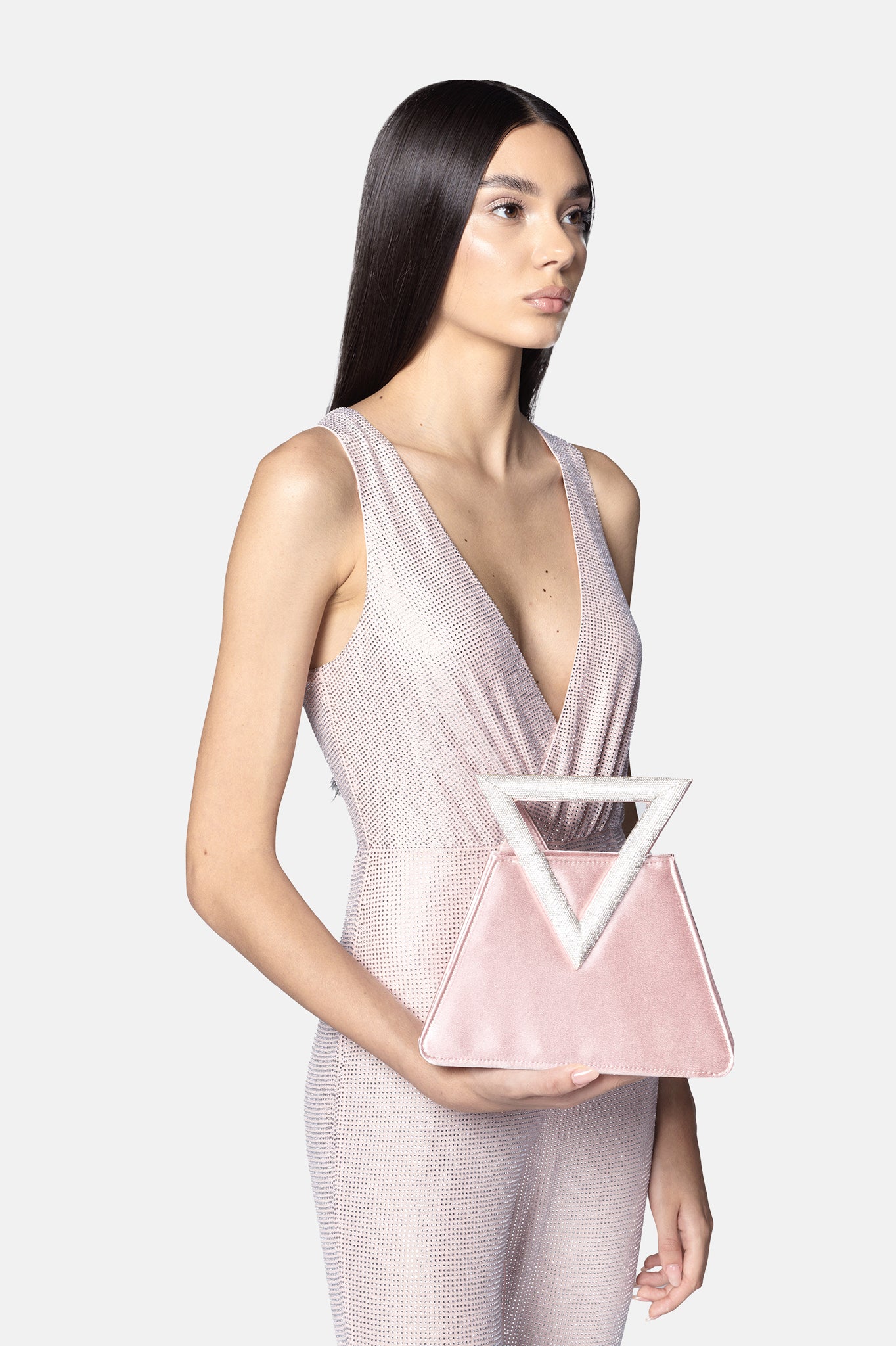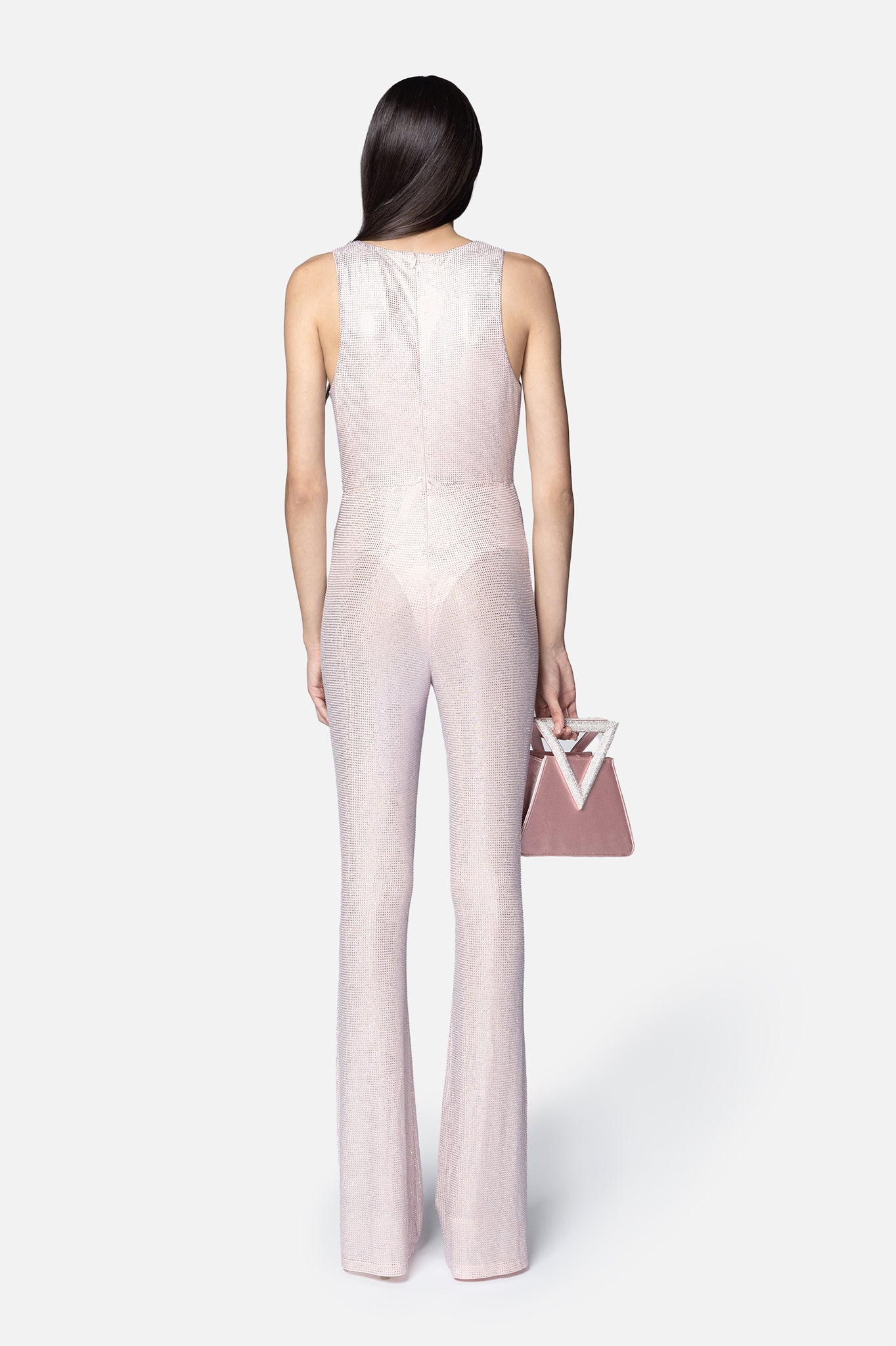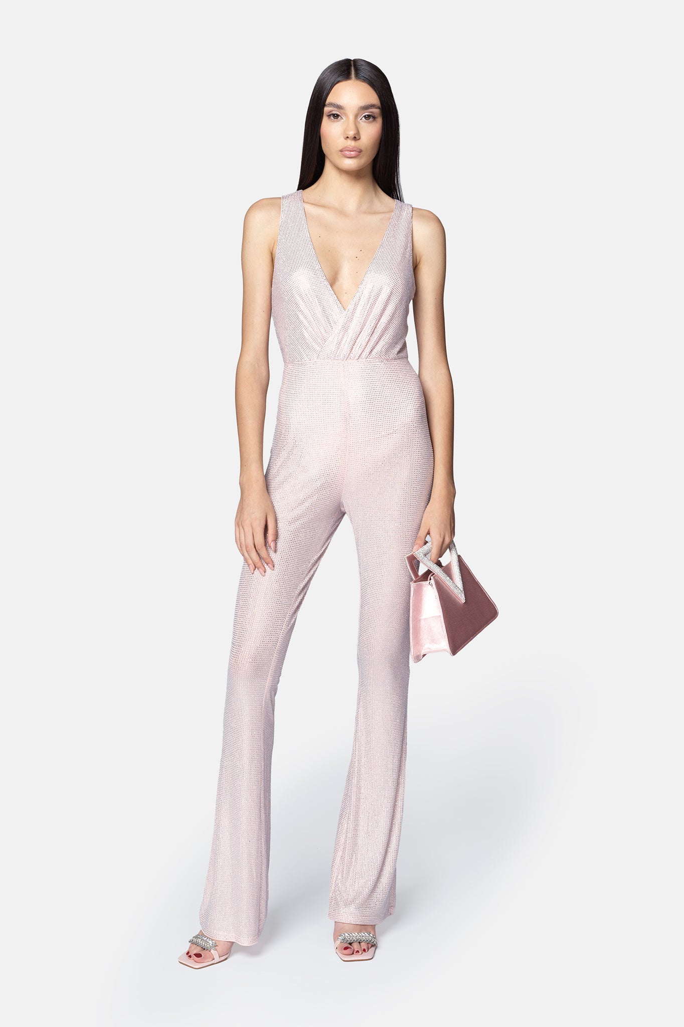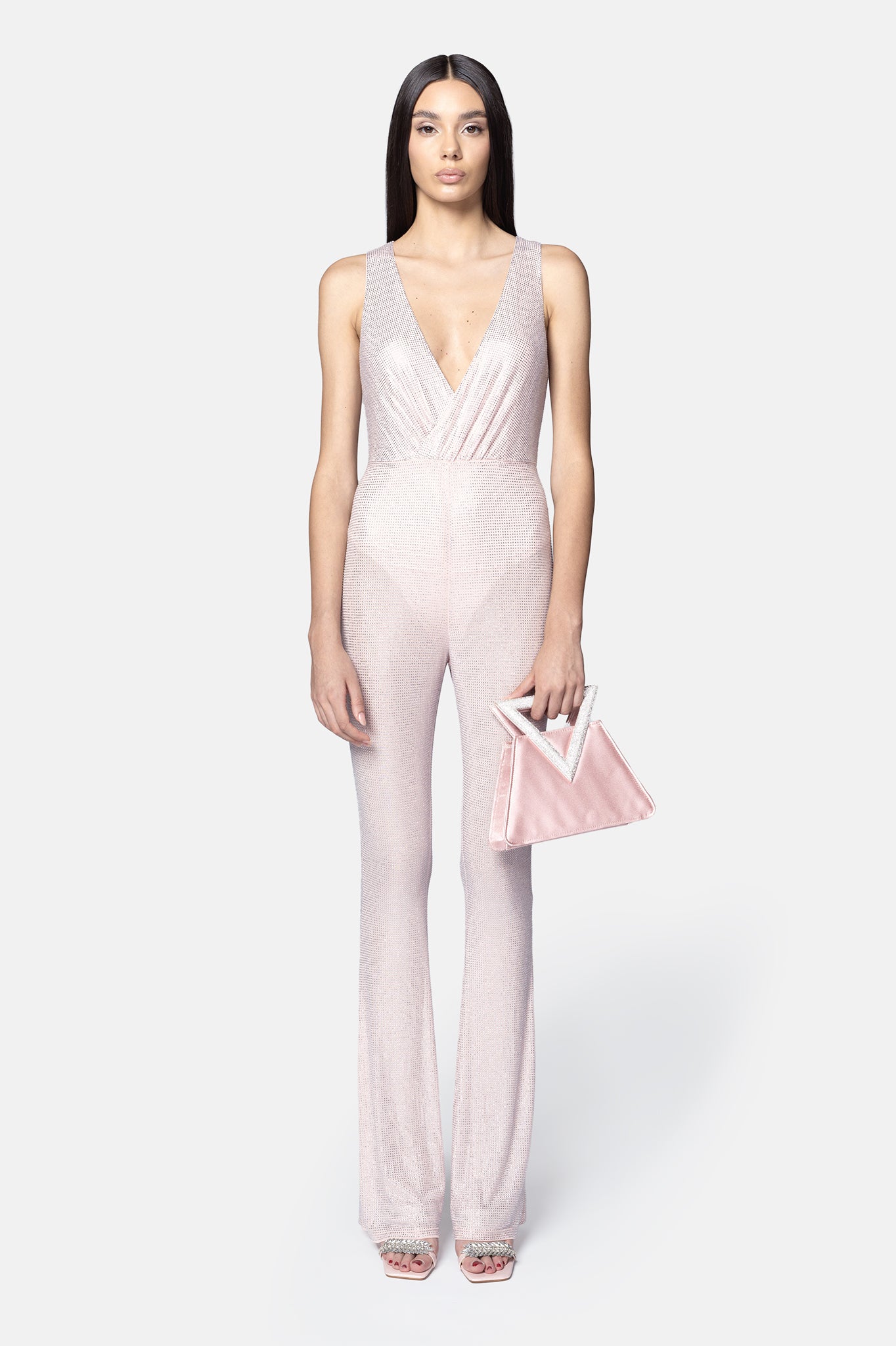 Mono Tuta Apollo color maquillaje en tul y tejido elástico cubierto de strass, línea ajustada. Pantalón con bajo ancho y escote en V profundo al frente.